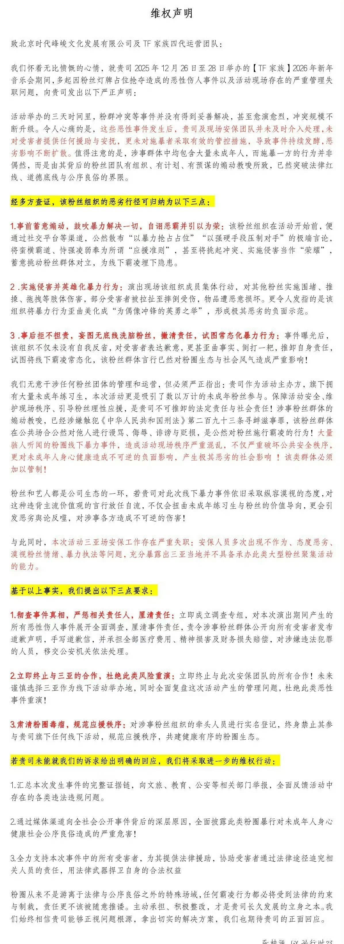 2025年12月26日至28日三亚新年音乐会期间,多家粉丝因灯牌占位爆发肢体冲突,涉及围堵、拖拽及物品损坏,部分受害者受伤且含大量未成年人。九家四代练习生数据组如张桂源、杨博文、王橹杰等联合声明,指控某粉丝组织蓄意煽动暴力、歪曲霸凌行为,要求时代峰峻彻查事件、赔偿受害者、终身禁止涉事者参与线下活动,并终止与三亚合作。